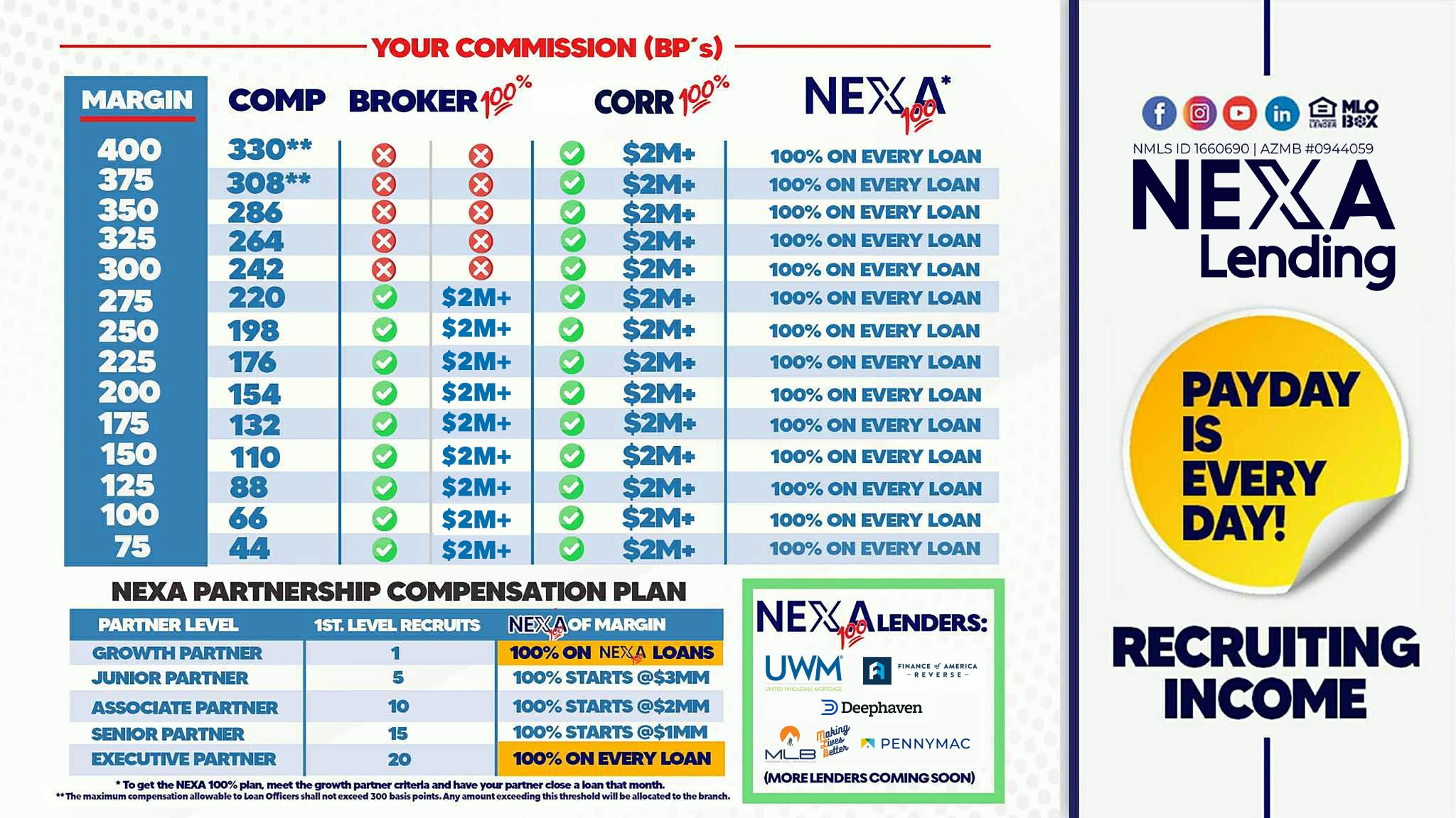 You start out at the highest comp plan of 220BPS and can earn up to 275BPS + residual income. Obviously, in some markets to be competitive you’ll voluntarily lower that. And as a thank you for helping NEXA grow should you decide to get into it, you become a partner and get a 100% commission split. Here’s the chart: